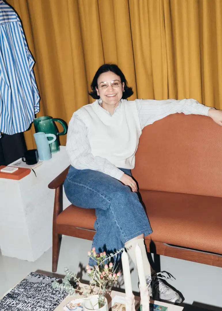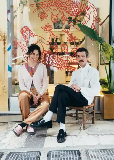 On the other side of the street, you’ll find a sun-filled shop designed to resemble a glamorous 1970s hotel, complete with mesh chairs (reminiscent of the ones found in Athens’ popular outdoor cinemas), colourful tapestries and aquamarine tiles. This is the home of Ancient Greek Sandals, another local label that has achieved international recognition and established itself among the new generation of Athens’ luxury that Athenian brands are achieving, with its footwear collection (beyond the signature summer sandals, you’ll find shearling slippers, ballet flats and more) and curation of other international labels, from Italian sock label Maria La Rosa to Ukrainian outerwear specialist Ienki Ienki. “We have this home and we want to use it to bring friends of the brand together,” says co-founder Christina Martini.